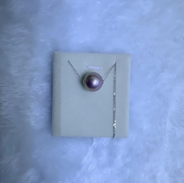 The Freshwater Aurora “Purple Empress” Longevity Pendant features a stunning 14-15mm pearl. This exquisite piece showcases a single large, luminous purple freshwater pearl, symbolizing elegance and grace. The pendant is designed in the “Longevity” style, allowing the pearl to glide freely along the chain, symbolizing smooth and unhindered passage through life.